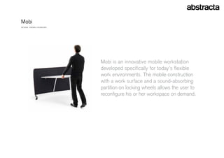The document discusses innovative workspace designs introduced by Abstracta in 2010, focusing on flexibility and creativity. Key products include the Mobi mobile workstation, Sketchalot modular whiteboard panel, Base & Rock'd poufs, and the Window magazine display, each enhancing collaboration and acoustic management. Additionally, the Triline acoustical panels are highlighted for their noise control capabilities.