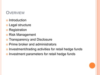 The document outlines a new regulatory framework for hedge funds, emphasizing investor protection, risk management, and transparency. It distinguishes between restricted and retail hedge funds, detailing their respective legal structures, registration requirements, and investment activities. Additionally, it highlights compliance necessities for managers, prime brokers, and administrators to ensure effective oversight and minimize systemic risks.