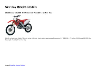 The document lists a variety of New Ray diecast models, including motorcycles, cars, and trucks, along with their respective scales and dimensions. Each model is made primarily of diecast metal, with some plastic components, and features movable parts where applicable. Notable models include various Honda, Kawasaki, and Ducati motorcycles, as well as classic car replicas and utility vehicles.