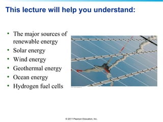 This document provides an overview of various renewable energy sources including solar energy, wind energy, geothermal energy, and ocean energy. It discusses technologies such as photovoltaic cells, wind turbines, geothermal power plants, tidal power dams, and wave energy devices. The key benefits of these renewable sources are that they have no emissions, are sustainable, and can help create new jobs. However, issues include high upfront costs and intermittent availability for some sources.