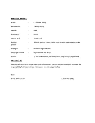 K. Thirumal Reddy has over 10 years of experience in retail portfolio management and computer applications. He has a B.Tech in electronics and communication engineering and is proficient in C language, Java, and Microsoft Office. His career objective is to contribute quality ideas and work to an organization where he can grow both individually and help the organization. He has participated in various academic projects and extracurricular activities related to robotics and app development.