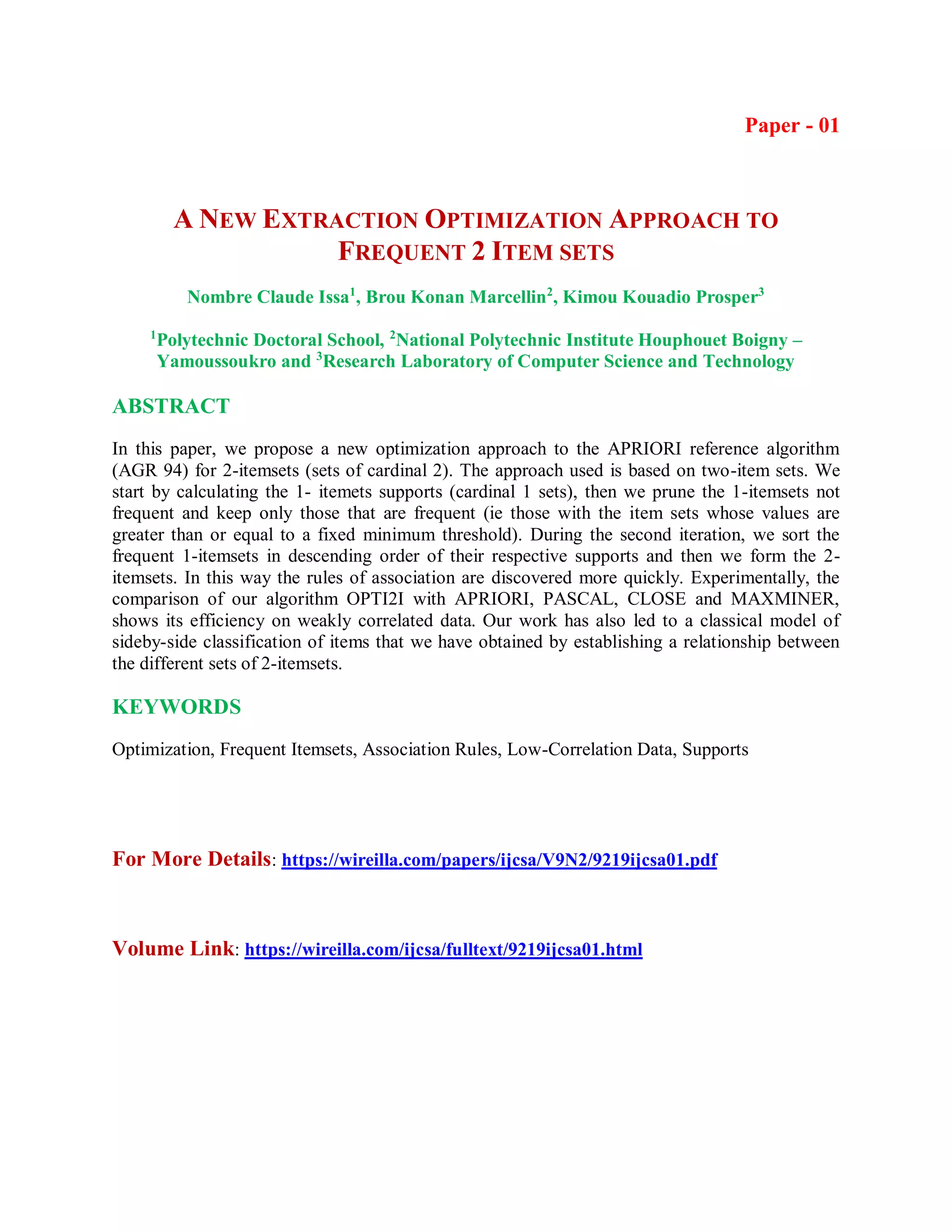 The document presents a novel optimization approach for the apriori algorithm focused on frequent 2-itemsets, proposing an efficient method for discovering association rules. The method involves calculating and pruning 1-itemsets based on a minimum support threshold, leading to quicker identification of itemsets. Experimental results showcase the effectiveness of the proposed algorithm, named opti2i, in comparison to existing algorithms on weakly correlated data.