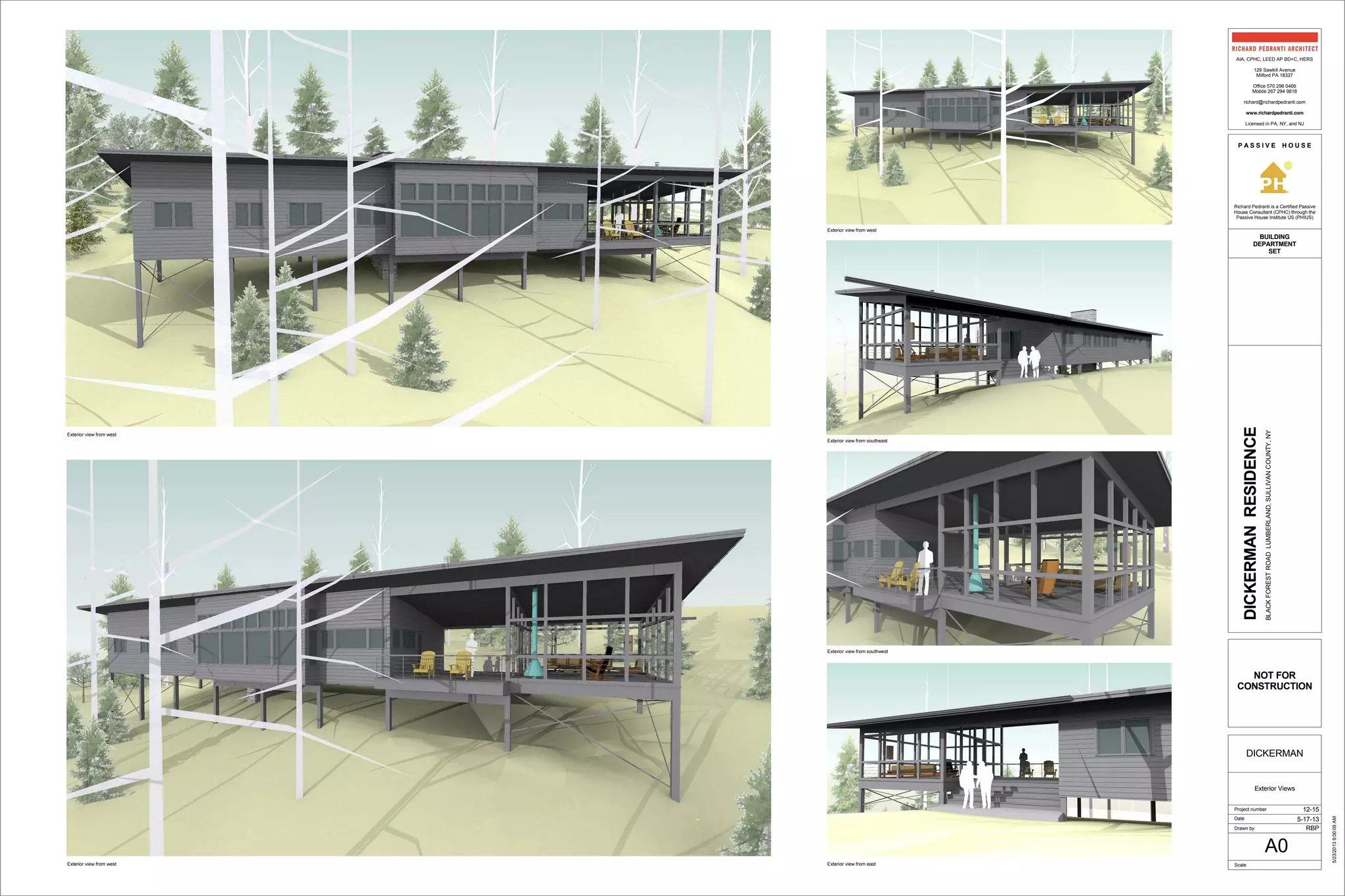 This document contains architectural drawings for a proposed single-family residence in Lumberland, New York. The drawings include site plans, floor plans, elevations, sections and details of the building. Notes on the drawings indicate it will be a 1,500 square foot structure constructed on pier foundations with a metal roof. Energy compliance will be verified through a HERS rating by the architect.