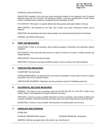 This material safety data sheet provides information on NRO Green Sand, which is used for divot repair and ground leveling. It consists mainly of silica (80-90%) and smaller amounts of iron oxide, barium sulfate, and manganese dioxide. Inhalation of dust particles can cause irritation but the material itself is not absorbed by the body. Proper protective equipment should be used if exposure limits are exceeded. The product is chemically inert and stable, and does not burn or support combustion. Spills can be cleaned up by vacuuming or scooping and avoiding dust conditions.