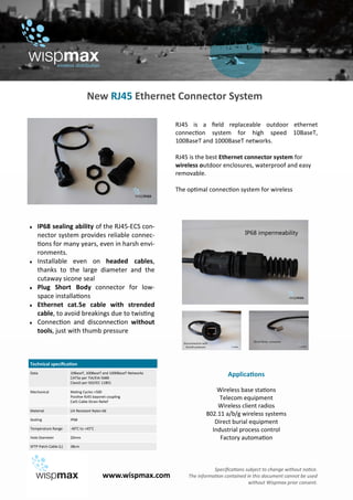 The document details the features of the IP68-sealed RJ45-ecs connector system, designed for reliable connections in harsh environments and easy installation on headed cables. It is compatible with high-speed 10BASE-T, 100BASE-T, and 1000BASE-T networks, and allows tool-free connection and disconnection. The connector is suitable for various applications, including wireless base stations and telecom equipment, with a temperature range of -40°C to +45°C.