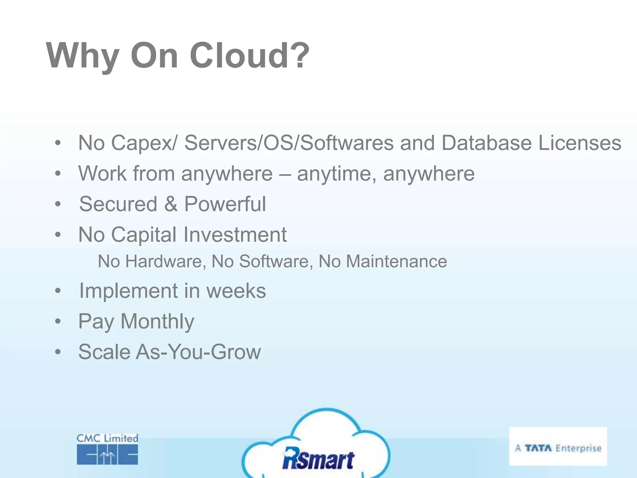 The document describes an HR management software solution called Rsmart HR that is available on the cloud. It offers modules for recruitment, employee information management, payroll, training, leave management, and more. Customers can choose which modules they need and pay monthly without large upfront costs. The software aims to manage all employee processes from hiring to retirement in a secure, flexible cloud system.