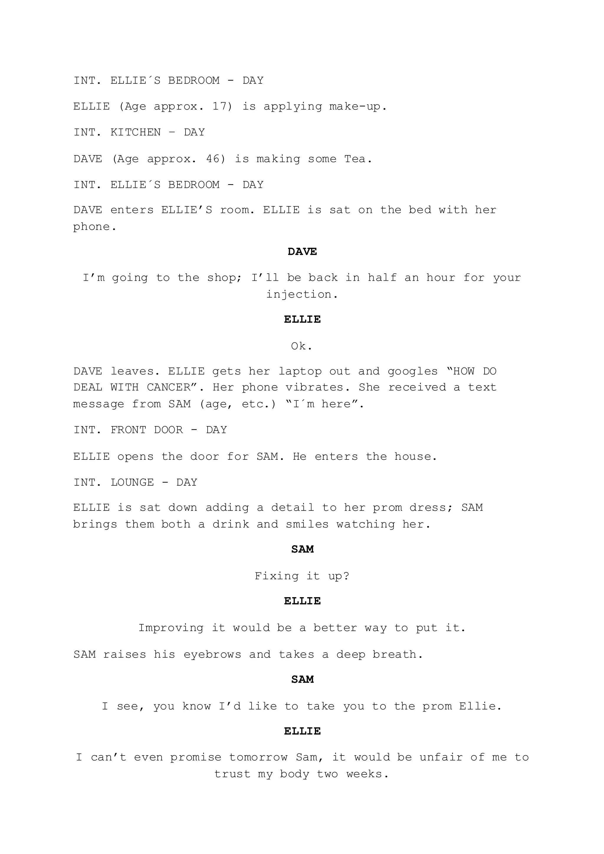 Ellie is a 17-year-old girl with cancer who is nearing the end of her life. Her overprotective father Dave does not approve of her relationship with Sam and forbids him from visiting. After Sandy, Ellie's caretaker, encourages Ellie to spend time with Sam, Dave has a change of heart and arranges a prom for Ellie and Sam in their home before leaving them alone.