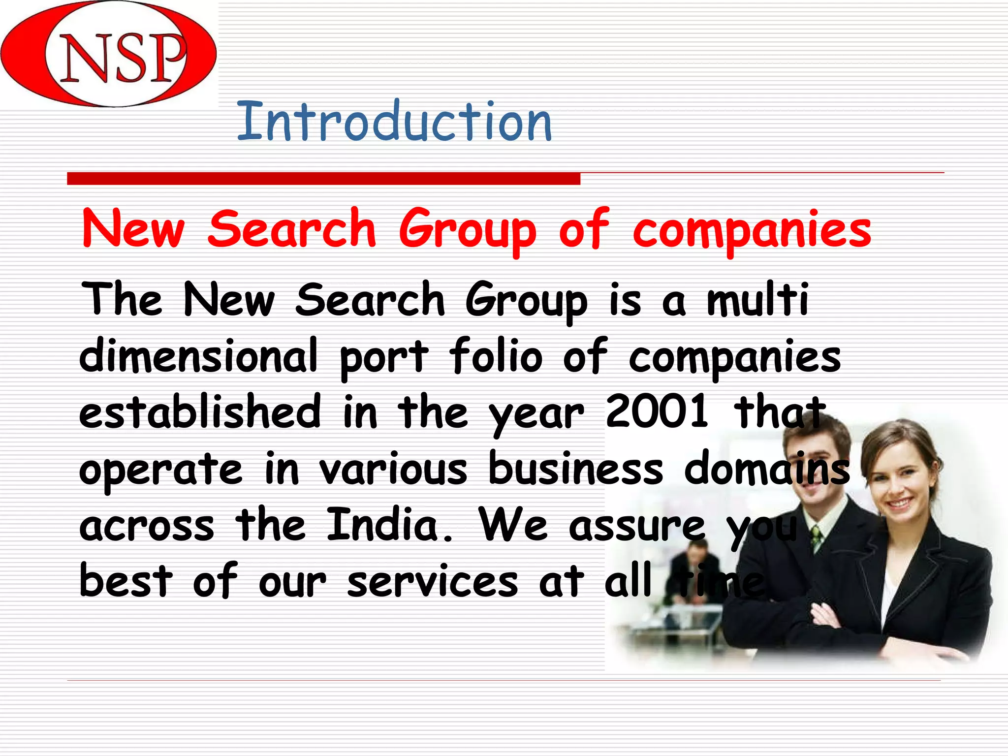 The New Search Group, established in 2001, operates a diverse range of services in India including placement, manpower outsourcing, training, industrial investigation, facility management, and travel services. The company aims to provide skilled professionals for businesses while maintaining high standards of service and a focus on client satisfaction. With a commitment to empowering organizations at a low cost, New Search Group emphasizes the importance of meritocracy, discipline, and credibility in its operations.