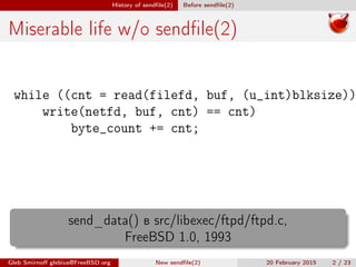 The document discusses the history and evolution of the sendfile(2) system call, exploring its initial implementation, the challenges it faced, and the optimizations made over the years. It highlights various performance issues related to blocking I/O and introduces a new non-blocking implementation with advantages and disadvantages. The document also outlines future plans for sendfile(2), such as addressing virtual memory and I/O overcommit problems.