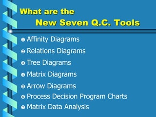 This document provides an overview and instructions for using the New Seven Quality Control tools, which were developed to organize verbal data in a visual way. It begins with an introduction to the New Seven tools and their history. Then each tool is explained in its own section with advantages, construction steps, and an example. The tools covered are Affinity Diagrams, Relations Diagrams, Tree Diagrams, Matrix Diagrams, Arrow Diagrams, and Process Decision Program Charts. The presentation aims to teach people how to effectively use these tools to identify problems, generate solutions, and improve organizational processes.