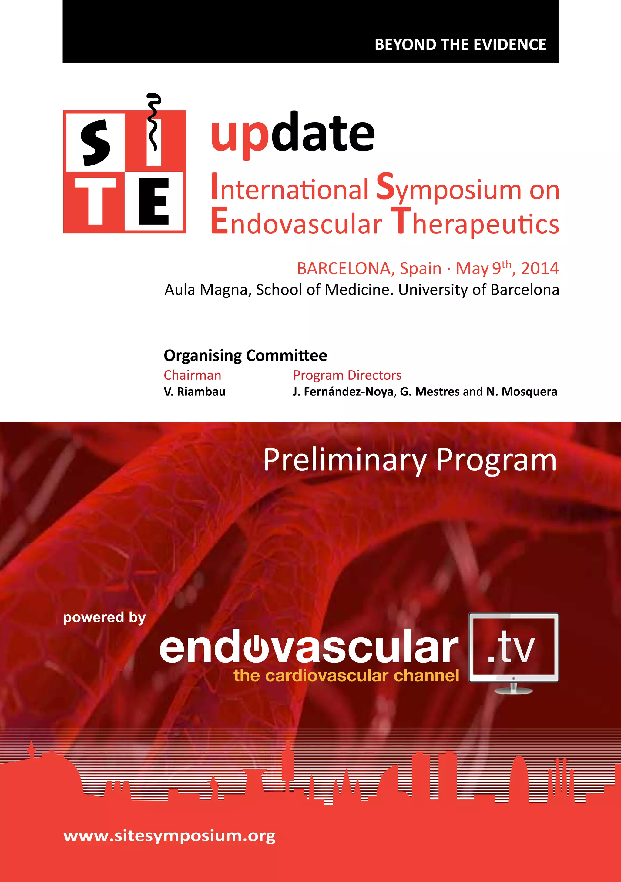 This document provides a preliminary program for the "Beyond the Evidence" International Symposium on Endovascular Therapeutics taking place in Barcelona, Spain on May 9th, 2014. The one-day symposium will focus on unsolved problems in aortic repair and lower limb endovascular therapy. It will include sessions on current limitations, unmet needs, and innovations from industry. There will also be opportunities to discuss unsolved clinical cases and for industry leaders to present new technologies in development. The target audience is advanced endovascular practitioners, bioengineers, industry managers, and health administrators.