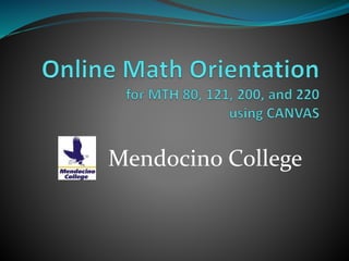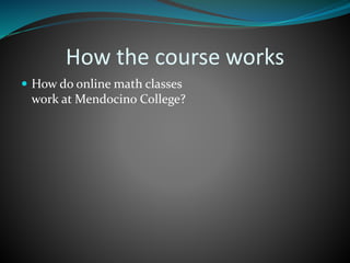 This document provides information about how online math classes work at Mendocino College. It explains that classes are organized into chapters and sections that include online lectures, homework assignments, quizzes and discussions. Students can access course materials and complete assignments through the MyMathLab online platform. The document provides guidance on obtaining access to MyMathLab, technical requirements, where to get help and key steps to follow at the start of the course.