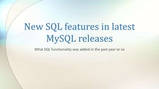 The document outlines new SQL features introduced in recent MySQL versions, focusing on functionalities such as using functions or expressions as default column values, functional key parts, and lateral derived tables. It details implications and examples for each feature, including how to generate default values for various data types and query optimizations. Additionally, it discusses check constraints now supported in MySQL, which allow defining both table and column constraints with specified expressions.