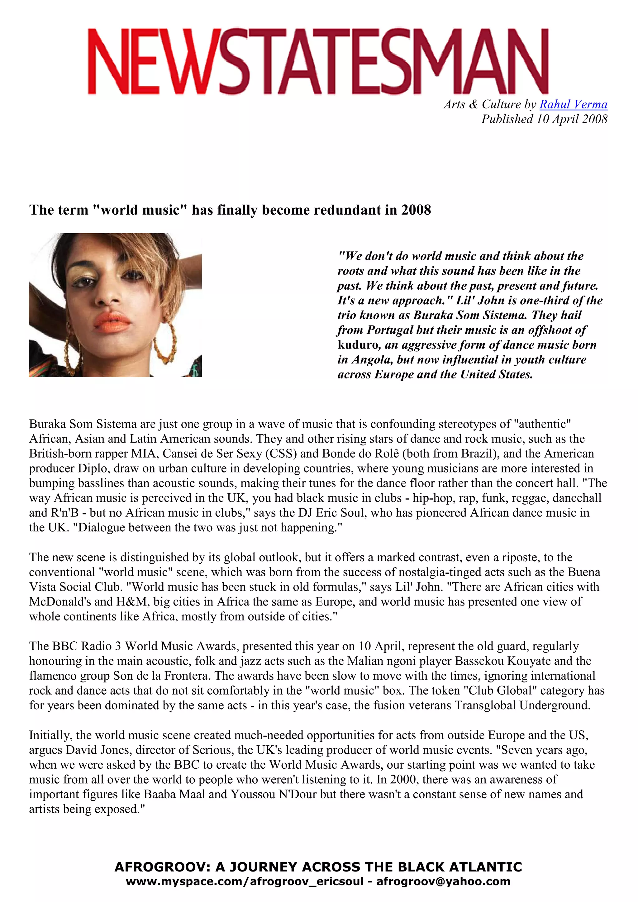 The document discusses how the term "world music" is becoming outdated as new artists draw from global urban music styles rather than focusing on traditional folk styles. It highlights several up-and-coming groups like Buraka Som Sistema and MIA that mix genres like kuduro, electro-rock, and baile funk. While events like the BBC World Music Awards still honor more acoustic styles, the democratization of the internet allows these new international artists to find audiences without labels' help. The term "world music" is increasingly seen as too limiting, and the music industry will need to recognize changes in the global music landscape.