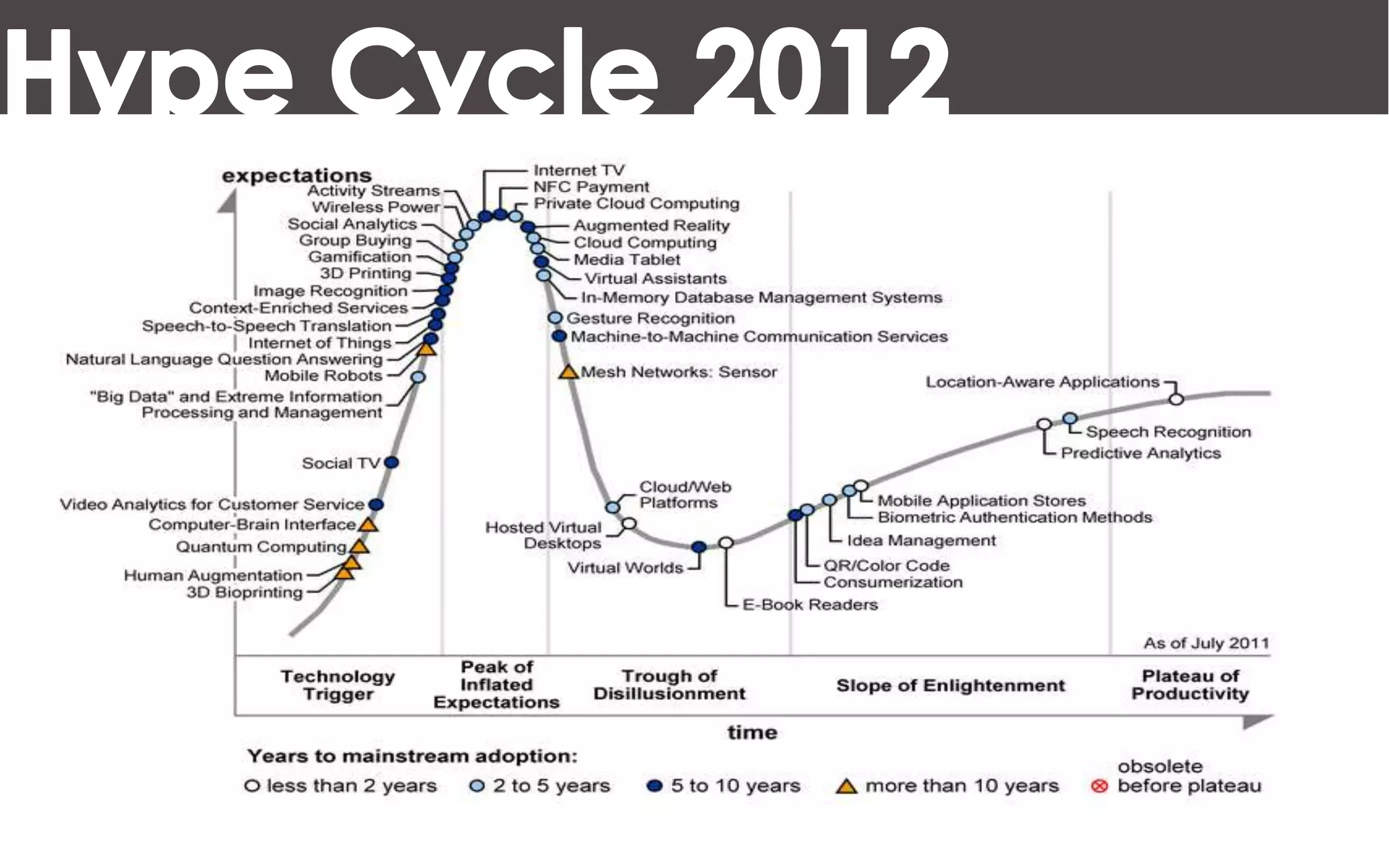 The document discusses several themes related to hype cycles and new technologies. It notes that hype often generates unrealistic expectations for new technologies and that most technologies take years to become mainstream after initial hype. It provides a graphic illustrating the typical stages in a hype cycle from an initial trigger of hype to a period of disillusionment and eventual acceptance if the technology proves useful. The document advocates allowing time for new technologies to mature rather than expecting immediate results from hyped technologies. It also stresses the importance of experimentation to understand benefits and practical applications of new technologies as they progress through the hype cycle.