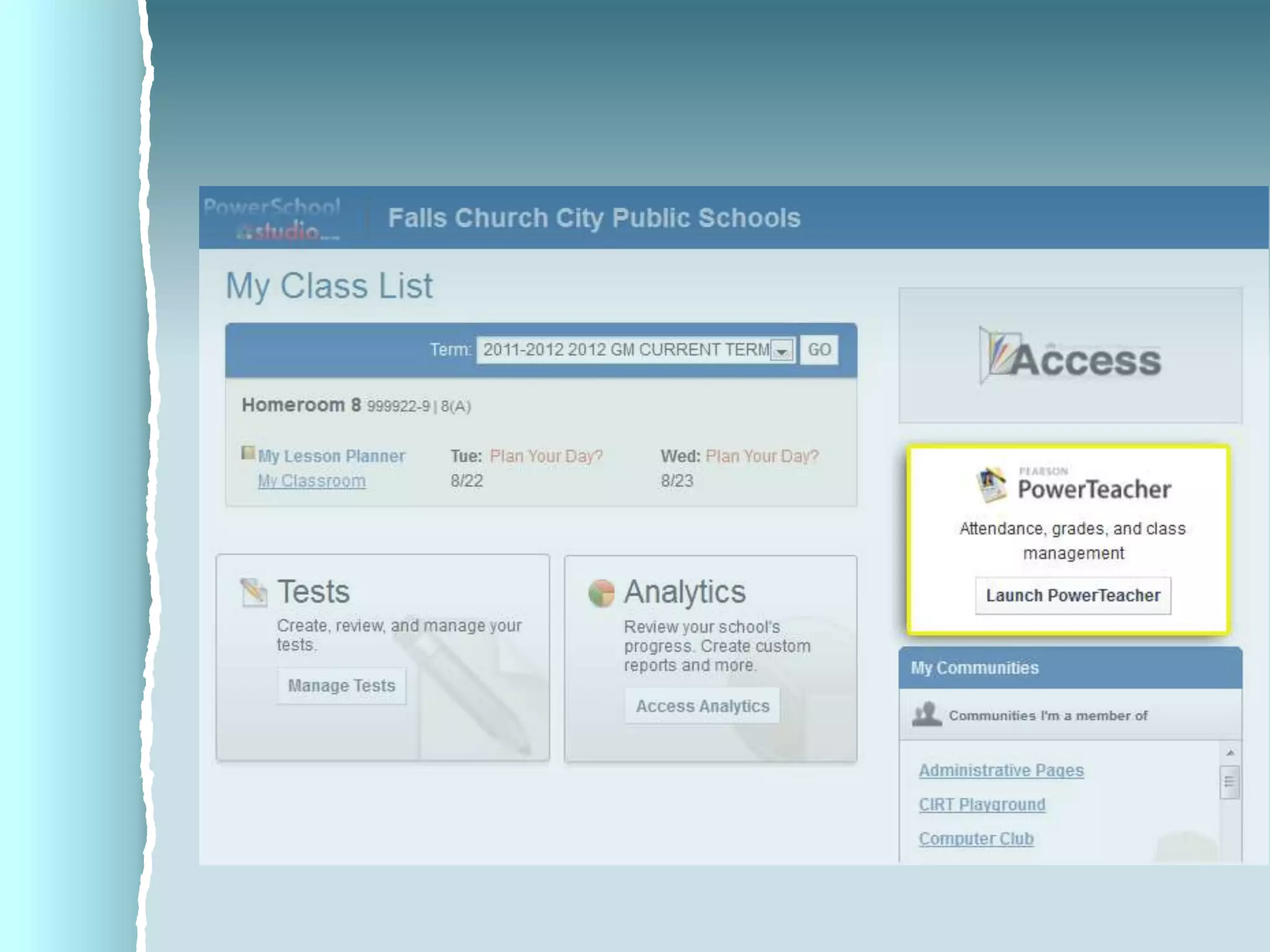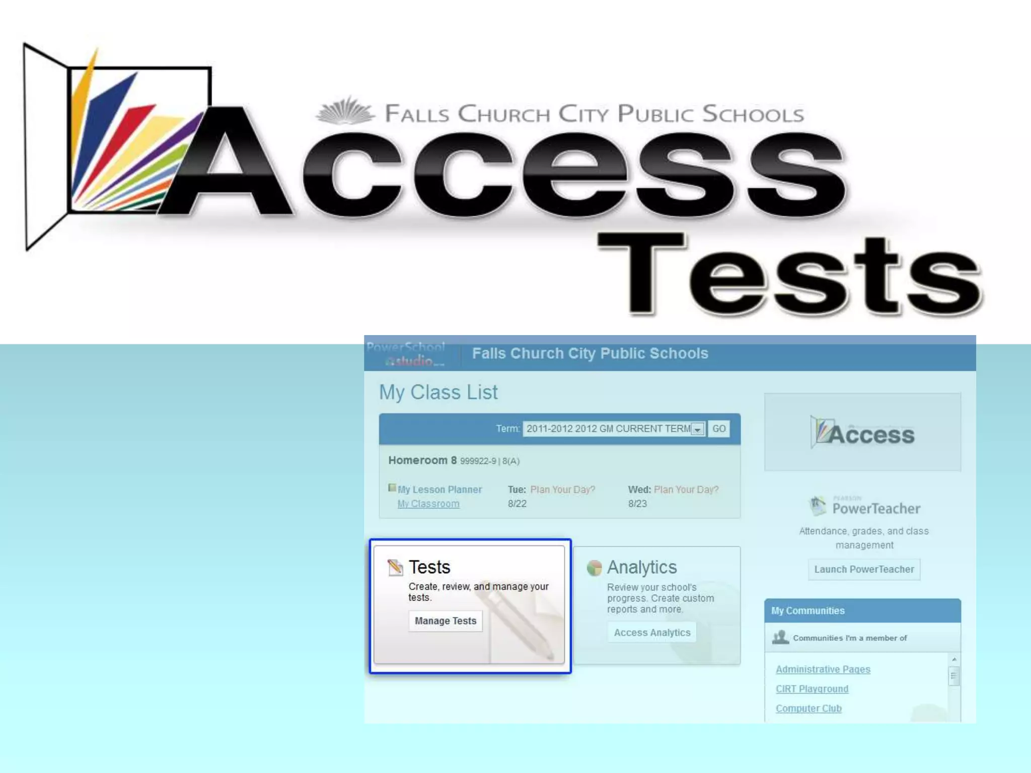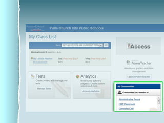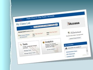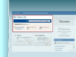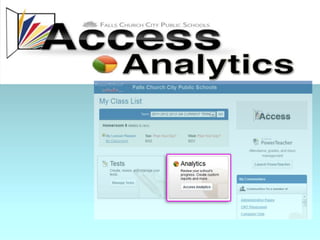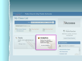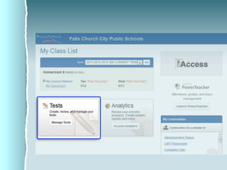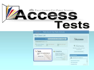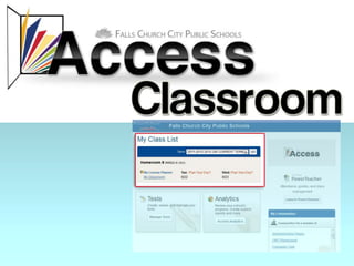 ACCESS is Falls Church City Public School's learning management system that allows teachers to create online classes, share content, assign and collect homework, and communicate with students. It also offers assessment tools like test banks and benchmark exams that generate reports on student performance, and allows viewing historical test data going back to 2005.