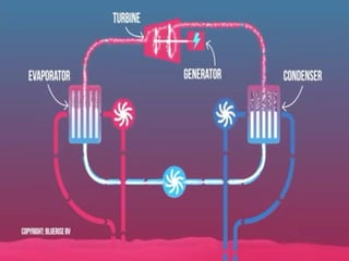 The presentation by Shadab Shaikh discusses new technologies in power generation, emphasizing the need to move away from traditional methods. It introduces various advancements, including spherical sun power generators and 3D printed solar energy trees, and explains the principle and efficiency of ocean thermal energy conversion (OTEC). The document highlights the relatively low efficiencies of OTEC compared to conventional power sources.