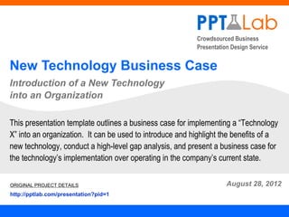 This document summarizes a presentation template for introducing a new technology called "Technology X" to an organization. The template outlines conducting a gap analysis of the current and future states, reviewing strategic options, and presenting a business case for implementing Technology X. It includes sections on an executive summary, overview of Technology X, a vendor comparison, and a SWOT analysis of one vendor.