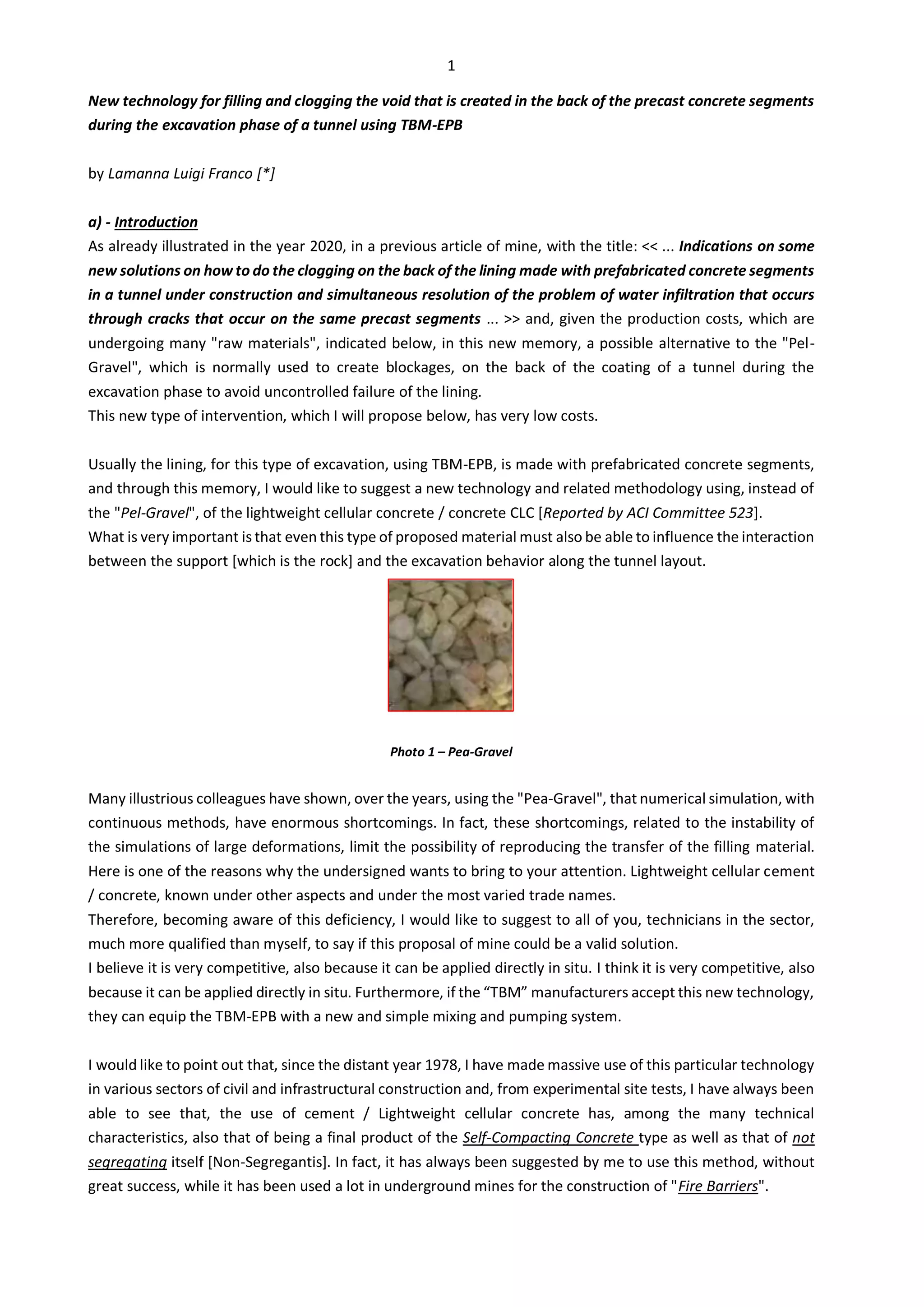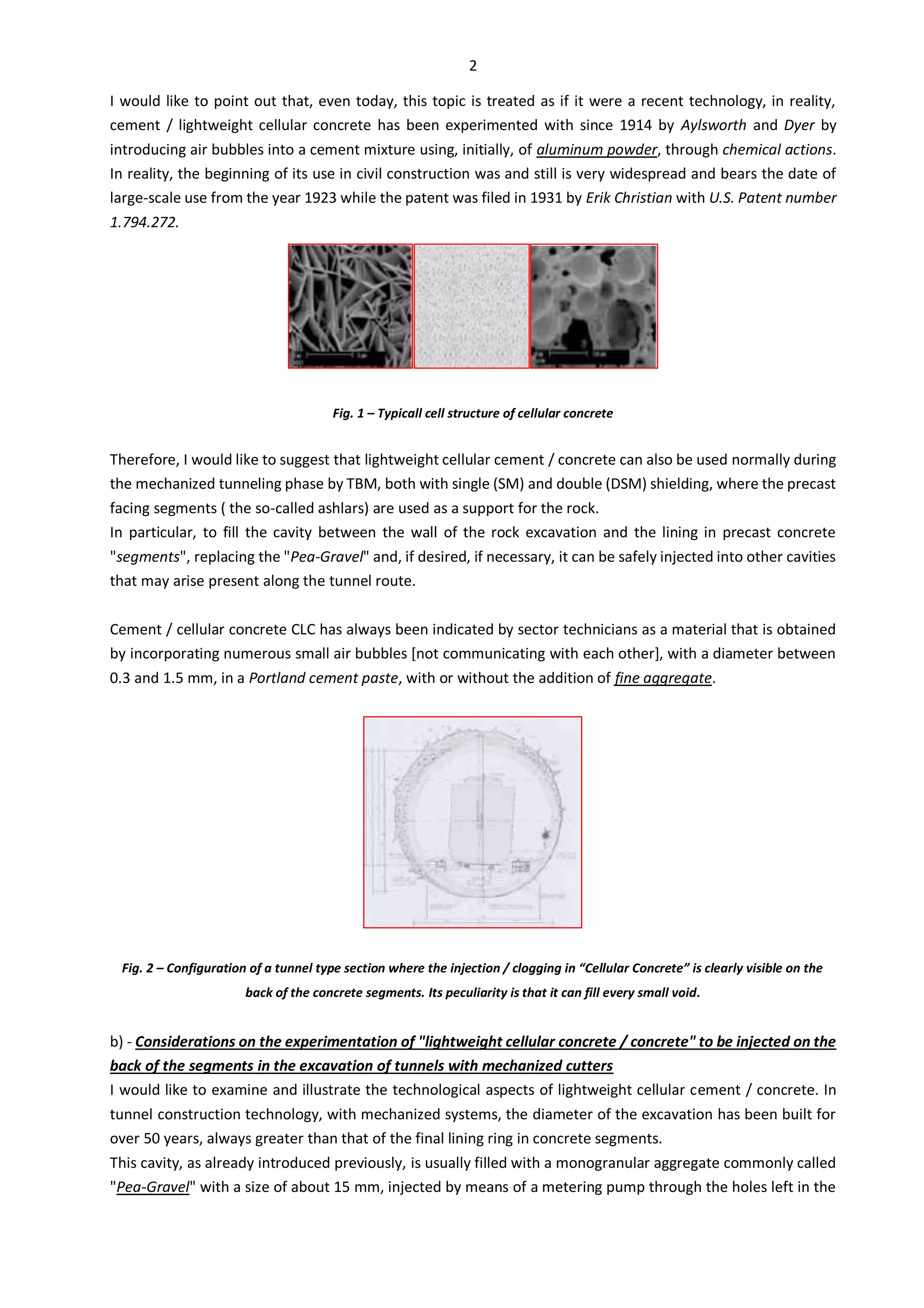 The document proposes a new technology for filling voids created during tunnel excavation using lightweight cellular concrete (CLC) instead of traditional pea-gravel. This method aims to enhance the effectiveness of the tunneling process with lower costs and improved material characteristics, such as self-compaction and impermeability. The proposal also suggests that if accepted by TBM manufacturers, it could simplify the mixing and pumping systems used in mechanized tunneling projects.