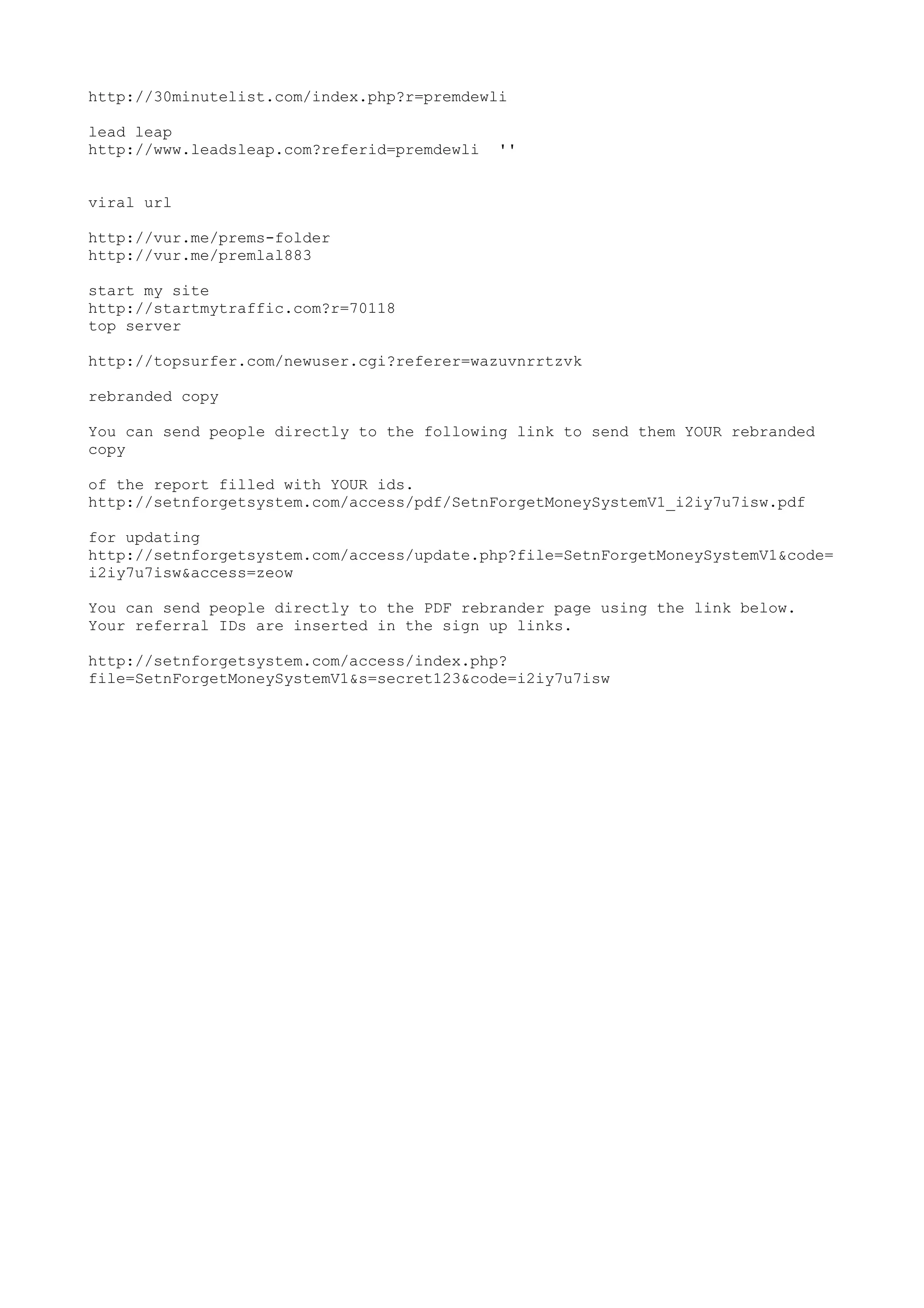 This document contains various links for marketing and traffic generation purposes, including links for lead generation, viral marketing, starting a website, getting server traffic, and rebranded copies of a report with referral IDs inserted. The links provided can be used to send people to pages where they can access or update a rebranded copy of a report or sign up with a user's referral codes already included.