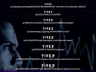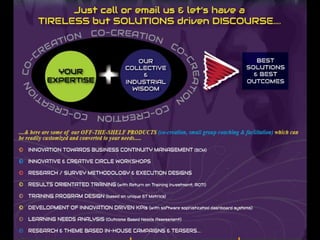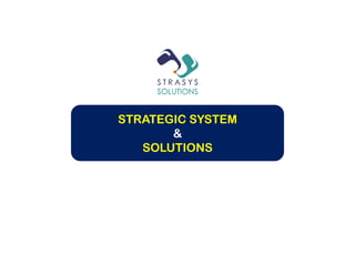 This document provides an overview of STRASYS Solutions, a consulting firm focused on systems improvements and innovations. The presentation outlines STRASYS' approach to consulting called the AVINASH model, which involves several stages from endorsement to sustainability planning. It also introduces STRASYS' proprietary DRSK framework, a unique approach to developing systems, products, and services that is focused on addressing variations to improve outcomes and impact stakeholder beliefs. The team includes several consultants with expertise in areas like quality management, human resources, and data analysis. STRASYS offers services in consulting, training, performance management, and management systems.