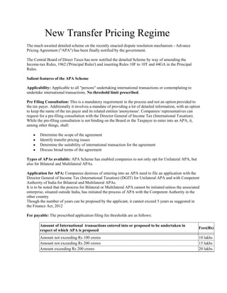 The Indian government has notified new rules for advance pricing agreements (APAs). Key aspects of the new APA regime include: (1) APAs can be unilateral, bilateral, or multilateral; (2) companies must undergo mandatory pre-filing consultations; (3) APAs cover transfer pricing methodology and price determinations for international transactions. In addition, domestic transfer pricing rules have been expanded and now apply to certain specified domestic transactions over Rs. 5 crore. This will impact many industries and require analysis of business models and pricing for domestic deals.