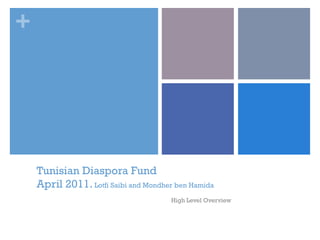 This document outlines a preliminary engagement model to leverage the Tunisian diaspora following the January 2011 revolution. It proposes creating a virtual portal and think tank to tap into Tunisian experts abroad and raise funds. The goals are to turn the diaspora into active participants in rebuilding by collecting expertise and investment, especially for projects in poor regions. An initial fundraising goal of $1,000 per diaspora member is suggested. Key next steps include launching the portal and organizing a conference to establish think tank groups and review funded initiatives. Sustainability issues like declining interest and lack of local resources are also discussed, along with recommendations like collaboration with local leaders and community engagement.