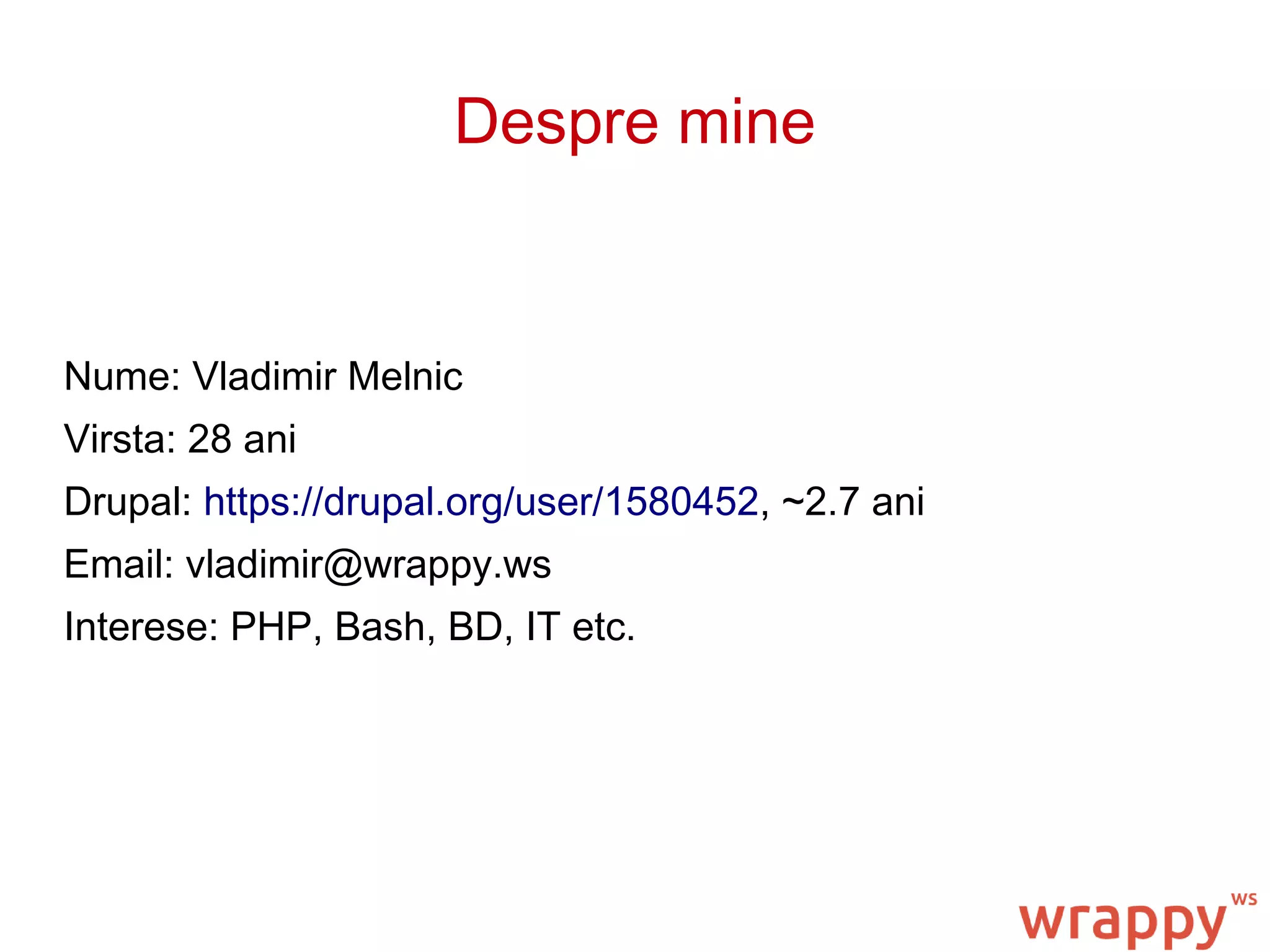 Wrappy is a new server administration and deployment platform for Drupal projects that aims to address common difficulties. It provides virtualization, version control integration, one-click deployment to multiple environments like local, Amazon, DigitalOcean. This allows developers, sysadmins, project managers, and others to securely manage servers, software installation, backups, users and more for their Drupal projects and teams in an all-in-one platform. The presentation provides an example workflow and explains how Wrappy can benefit different user types and enterprises.