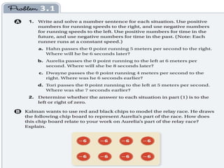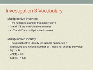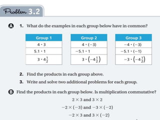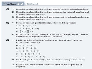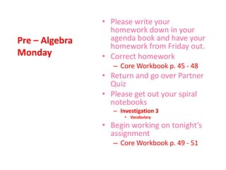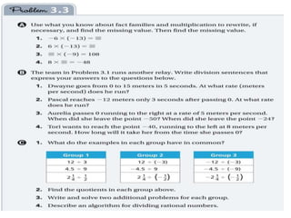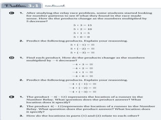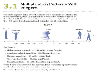 This document provides an overview of the daily lessons and assignments for a Pre-Algebra class over the course of a week. It includes warm-up problems, homework assignments from the textbook, discussions of previous lessons, and introductions to new topics like multiplication patterns with integers and division of rational numbers. The class will cover investigations and vocabulary related to rational numbers and operations involving integers.