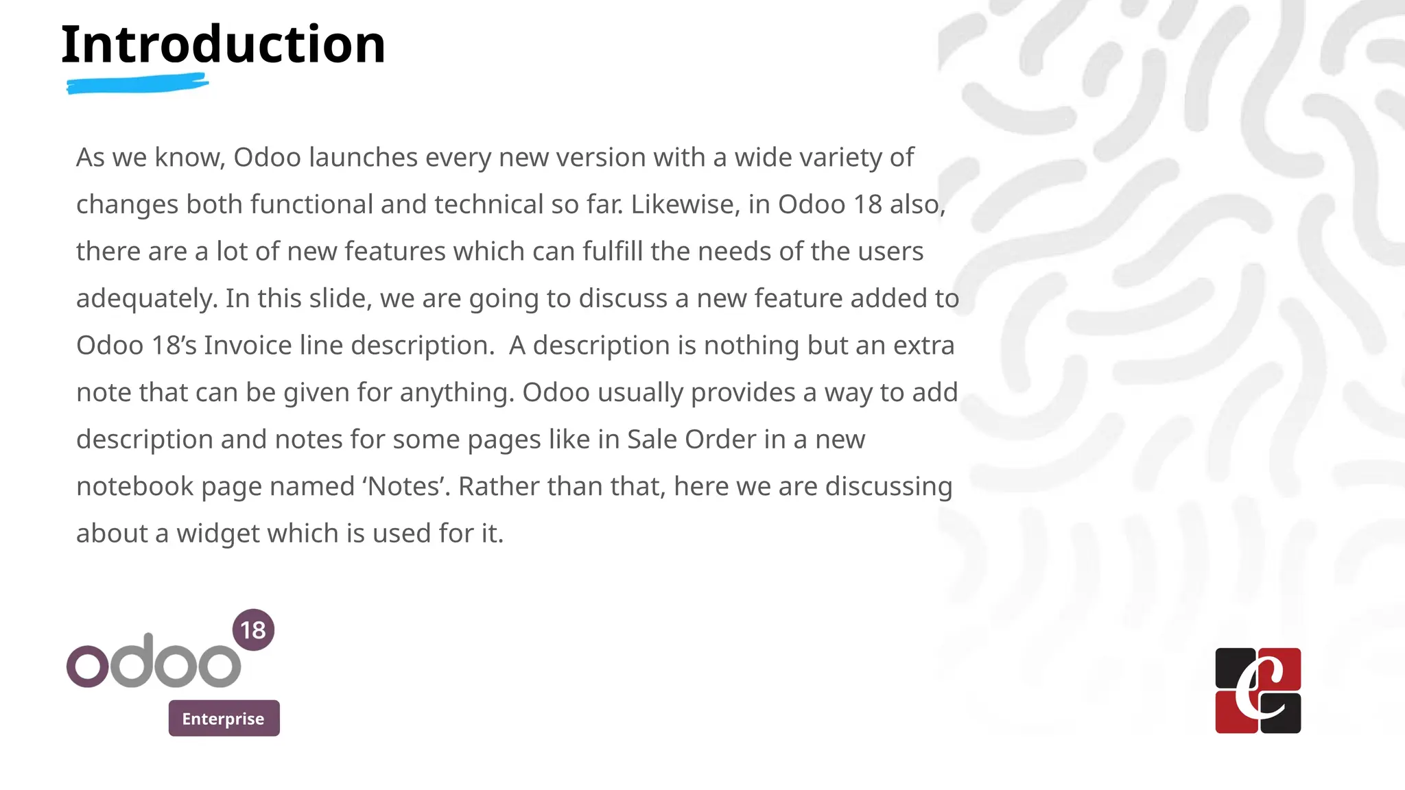 As we know, Odoo launches every new version with a wide variety of changes both functional and technical so far. Likewise, in Odoo 18 also, there are a lot of new features which can fulfill the needs of the users adequately. In this slide, we are going to discuss a new feature added to Odoo 18’s Invoice line description.