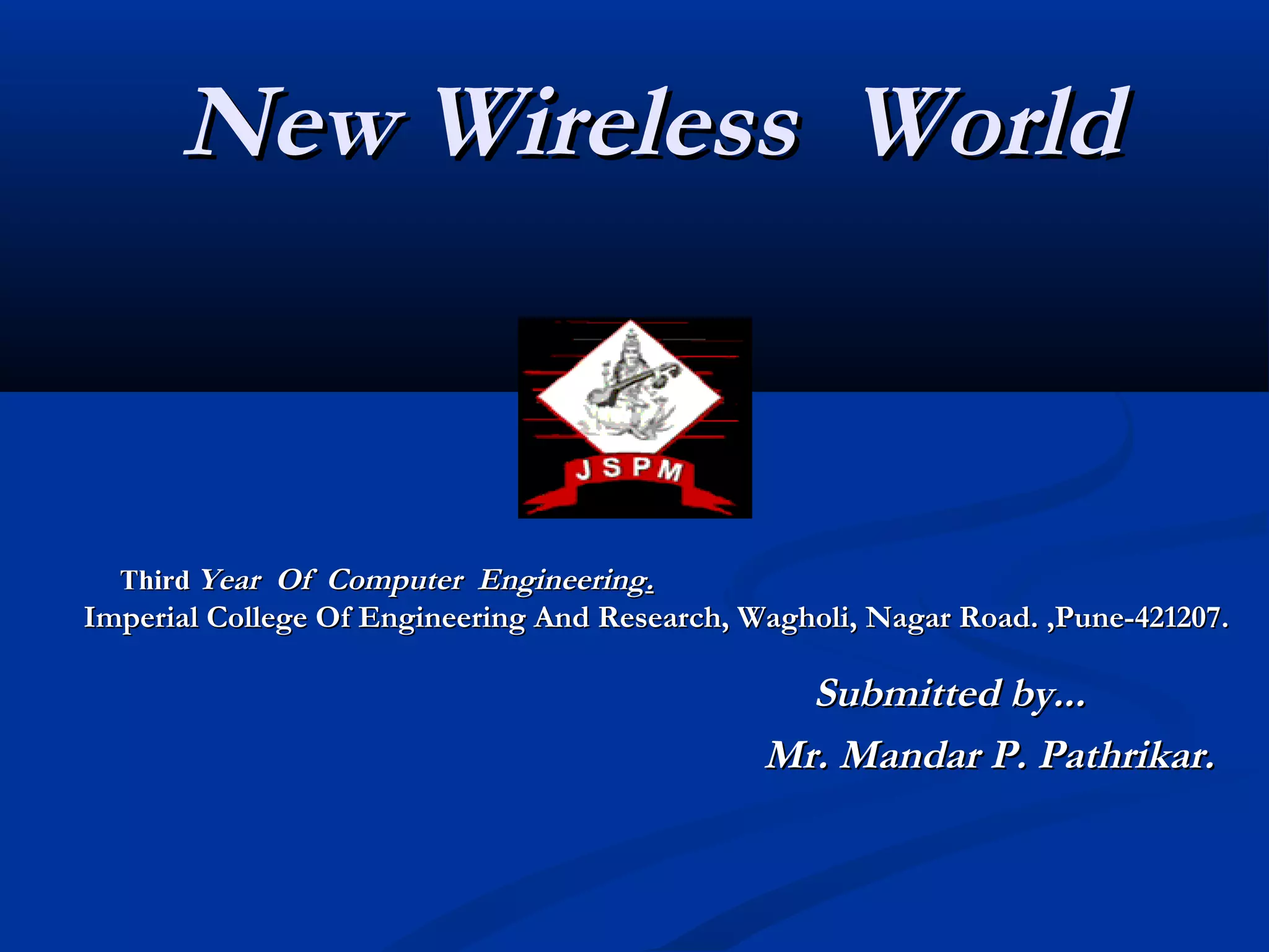 The document discusses the advancements in wireless technology, emphasizing its role in enhancing communication and economic growth. It covers specific applications like Bluetooth and wireless cameras, as well as the integration of cloud computing with wireless LAN. The future scope includes developing more technologies with wireless capabilities, such as smart car parking systems.