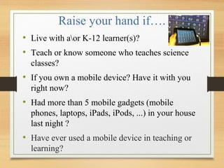 Mobile devices can enhance collaboration in K-12 science classrooms. The presentation discusses how mobile devices personalize learning, enhance social interactions, and allow for anytime/anywhere learning. Constructivism, behaviorism, situated learning, and social-cultural learning theories support using mobile devices for collaborative projects. Effective strategies include establishing group goals/rules, managing data amounts, using real problems, and incorporating collaboration tools. Mobile devices can support science learning through activities like field notes, simulations, discussions, and feedback.