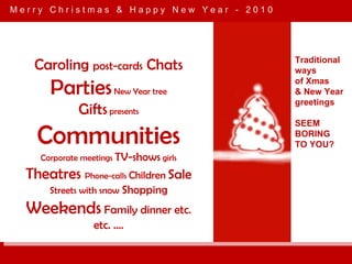 The document suggests innovative ways to celebrate Christmas and the New Year using web 2.0 services instead of traditional methods. It encourages using platforms like Flickr, Twitter, and Facebook to share greetings, create holiday blogs, and donate to charity. The author emphasizes personal change and creativity in holiday celebrations for 2010.