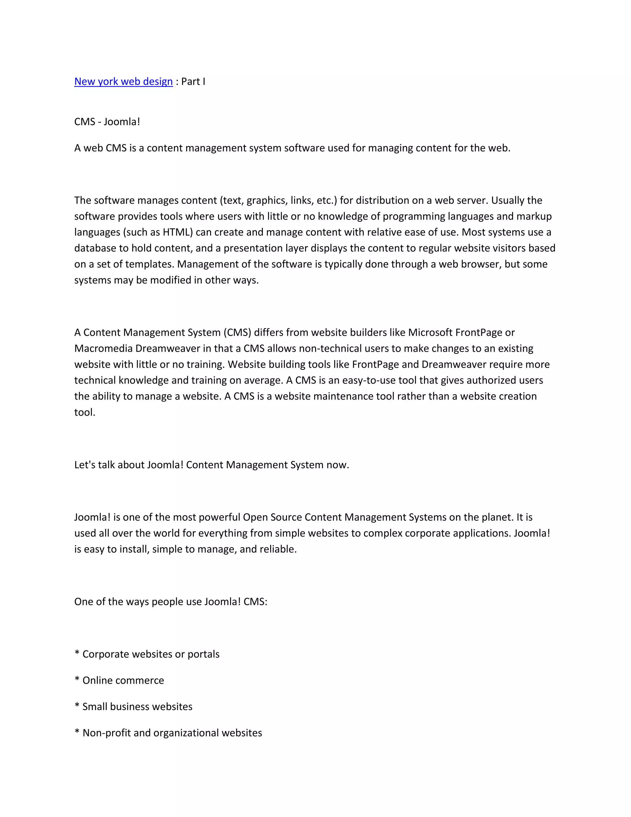 The document discusses content management systems (CMS) like Joomla and how they allow non-technical users to easily manage website content without extensive training. It provides an overview of what Joomla is and how it can be used to manage various types of websites. The document also discusses how thousands of extensions exist that add further functionality, such as e-commerce capabilities, forums, directories, and more. Joomla itself is free and open source.