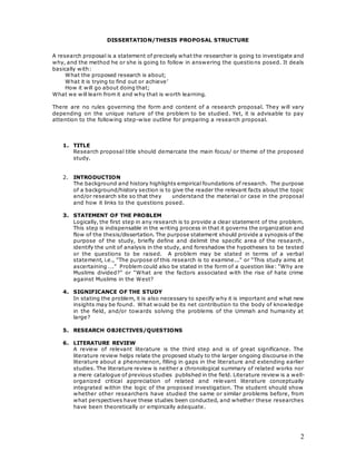 This document outlines the structure and components that should be included in a research proposal for a master's or PhD degree. It discusses that a proposal should include an introduction on the background and purpose of the study, a clear statement of the research problem or question, the significance of studying the problem, research objectives or hypotheses, a literature review, a theoretical framework, description of the research methodology and procedures, a proposed chapter outline, bibliography, and appendices. It also provides a research schedule template to plan out the timeline for completing the various stages of the research.