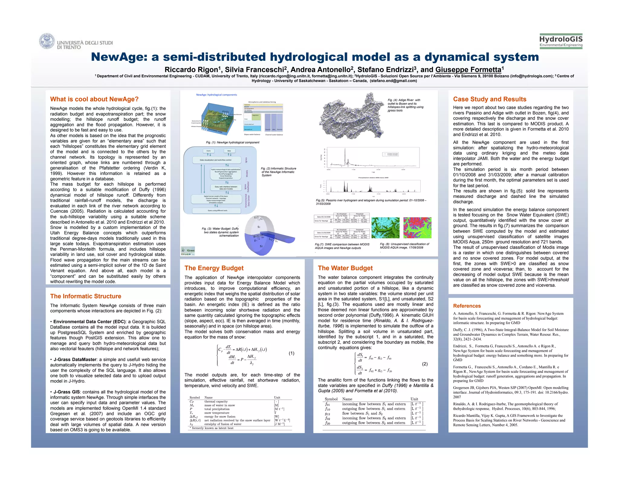 NewAge is a semi-distributed hydrological model that models the whole hydrological cycle, including radiation budget, evapotranspiration, snow modelling, hillslope runoff, runoff aggregation, and flood propagation. It is designed to be fast and easy to use. NewAge represents the topology of hillslopes and the river network as an oriented graph. It performs water and energy budgets for each hillslope based on modified Duffy and Utah Energy Balance models. The model outputs include effective rainfall, radiation, temperature, wind, and snow water equivalent. Case studies applying NewAge to the Passirio and Adige rivers in Italy are presented.