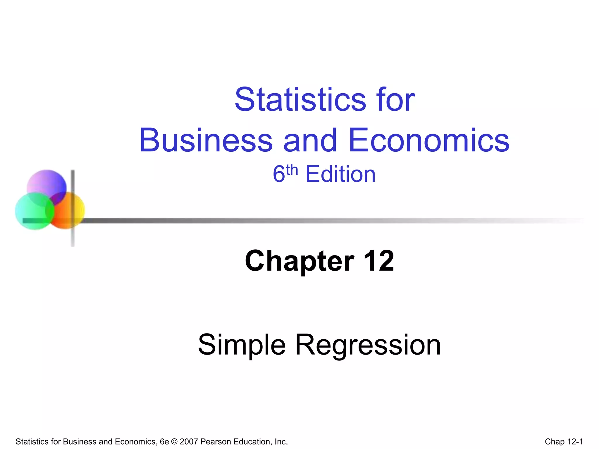 The document summarizes key concepts from Chapter 12 of the textbook "Statistics for Business and Economics". It introduces simple linear regression analysis and correlation analysis. The chapter goals are to explain correlation, the simple linear regression model, and how to obtain and interpret the regression equation and R-squared value. Examples are provided to demonstrate how to calculate a regression equation from sample data and interpret the slope and intercept. Measures of variation like total, regression and error sum of squares are also defined.