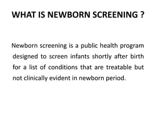 Newborn screening is a public health program that screens infants shortly after birth for treatable genetic or metabolic conditions. The goal is early detection so medical treatment can be promptly initiated to prevent irreversible damage. Conditions commonly screened for include phenylketonuria, congenital hypothyroidism, galactosemia, and maple syrup urine disease. Screening methods have advanced from bacterial assays of individual conditions to tandem mass spectrometry, which can screen for over 50 conditions in a single test.