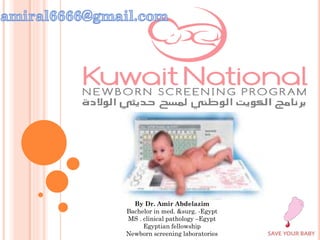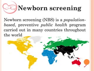 Newborn screening involves testing newborns for treatable genetic and metabolic disorders. It is a public health program that aims to identify affected infants early to prevent health problems. The document discusses the goals and components of newborn screening programs, including the diseases tested for, sample collection procedures, screening techniques, result interpretation, and confirmatory testing. It provides statistics on the increasing number of babies screened in Kuwait each year, from around 3,000 in 2005 to over 31,000 in 2014, demonstrating greater coverage of newborns over time.