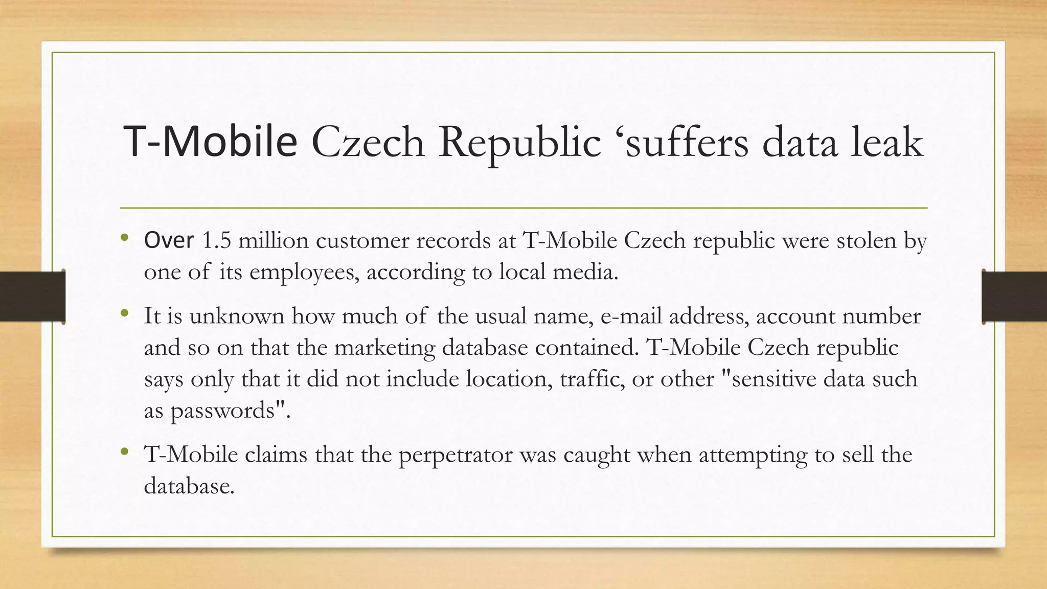Over 1.5 million customer records were stolen from T-Mobile Czech Republic by an employee. The records included names, email addresses, account numbers, but not location or traffic data. T-Mobile claims the perpetrator was caught trying to sell the database.