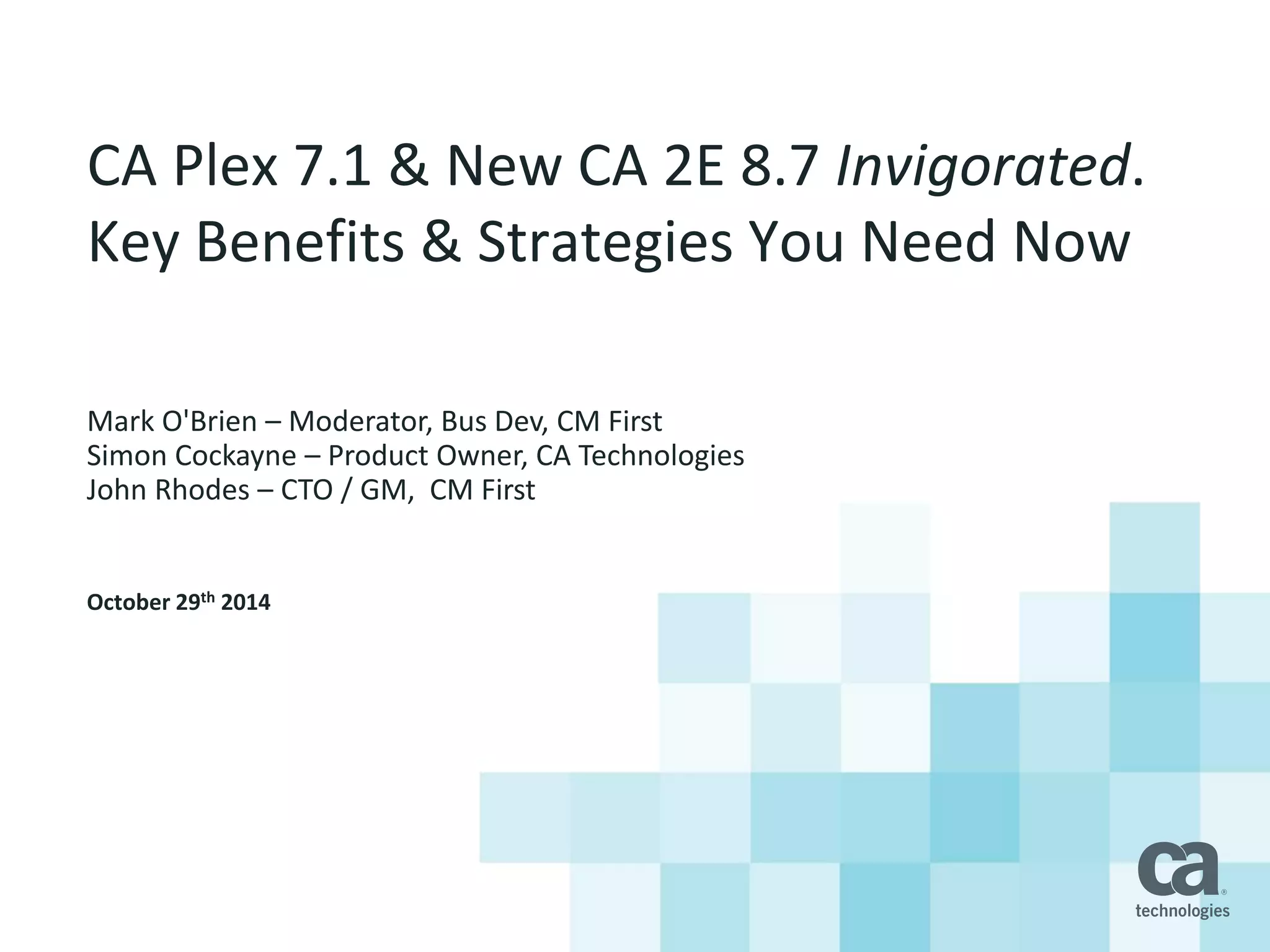 CA Plex 7.1 introduced new features like .NET ClickOnce deployment and localization support to simplify Windows application modernization. The release focused on improving support for third-party testing tools and adding customer-requested enhancements. CA Plex 7.2 will automate deploying proxies to Layer 7 gateways and enhance SQL support on IBM i systems, with the goal of supporting deployment of Plex business logic as Java web services. Future releases will continue to focus on customer-driven agile development through collaboration programs.