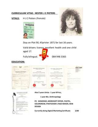 Hester J C Pieters has over 30 years of experience in administration, bookkeeping, and customer service roles. She is currently working as an administrator and receptionist at an optometry practice. Previously she held positions as practice manager for optometry and dental practices, where her responsibilities included accounts receivable and payable, liaising with medical aids, and managing staff. Pieters has a Bachelors in Procurement and Bachelors in Anthropology, and is currently studying for a Digital Marketing certificate. She is bilingual, proficient in Microsoft Office and accounting software, and is requesting a salary of R15,000 or more.