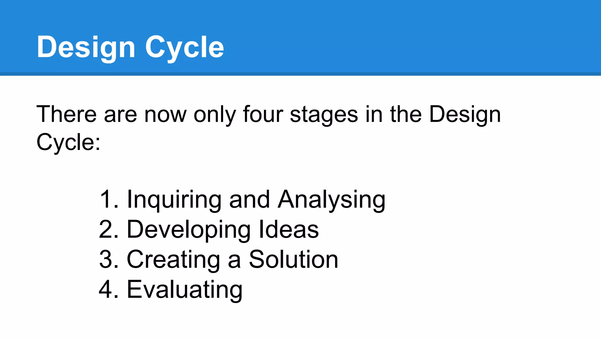 The document discusses changes to the design cycle process and assessment criteria. It outlines the four stages of the new design cycle as inquiring and analyzing, developing ideas, creating a solution, and evaluating. It provides details on what is included in each stage and assessment criteria. A high grade now requires more than just completing tasks - it demands high quality work with sufficient detail in each task as well as deeper reflection throughout the design cycle process.