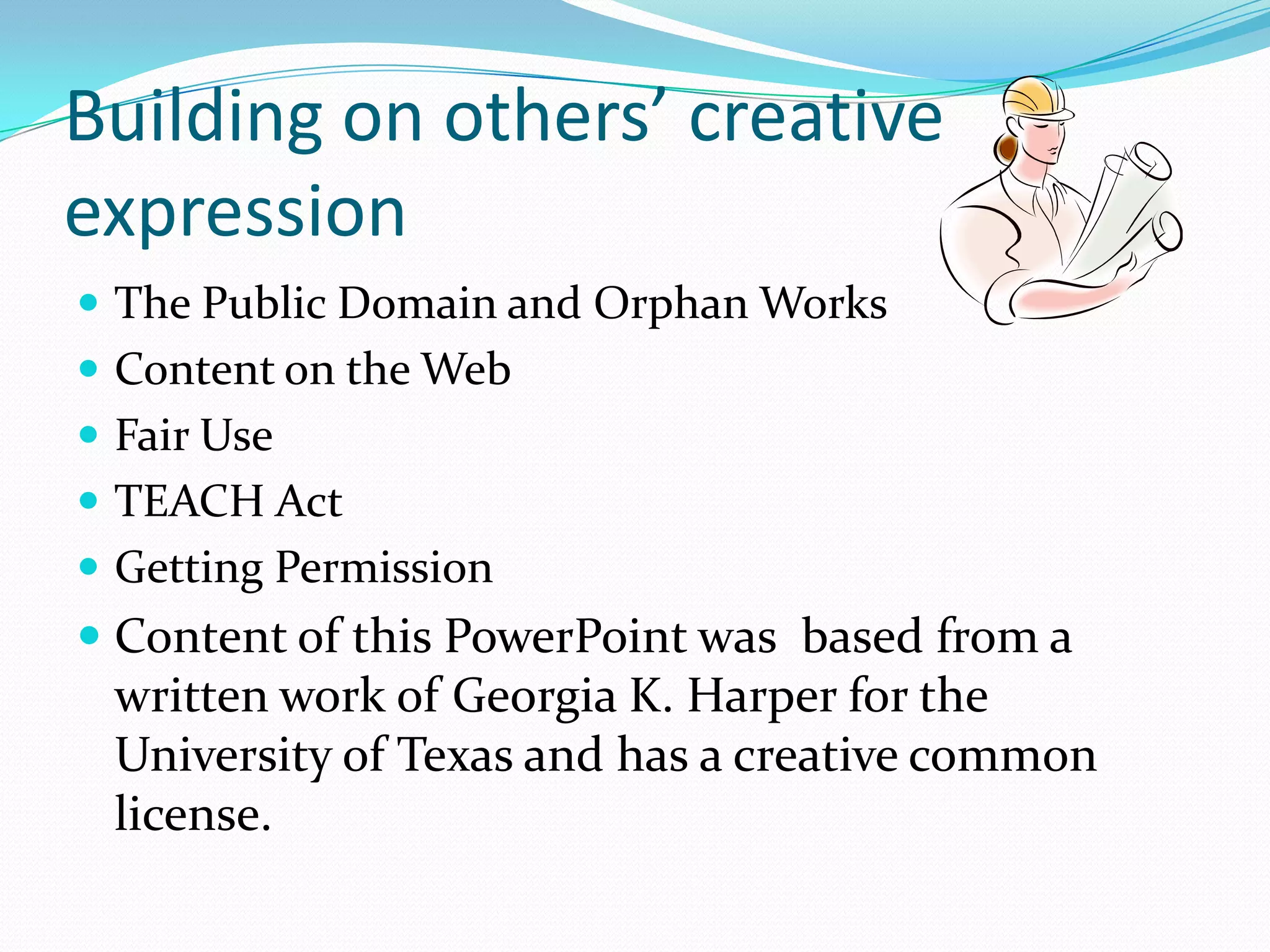 This document provides information about copyright and permissions for using others' creative works. It discusses topics like public domain works, orphan works where the owner cannot be found, fair use, the TEACH Act, and how to get permission from copyright holders. The document emphasizes getting proper permission or using works with licenses that allow sharing, as individuals can be liable for copyright infringement without permission. It provides guidance on determining if a work is protected, if fair use applies, and resources for obtaining permissions.