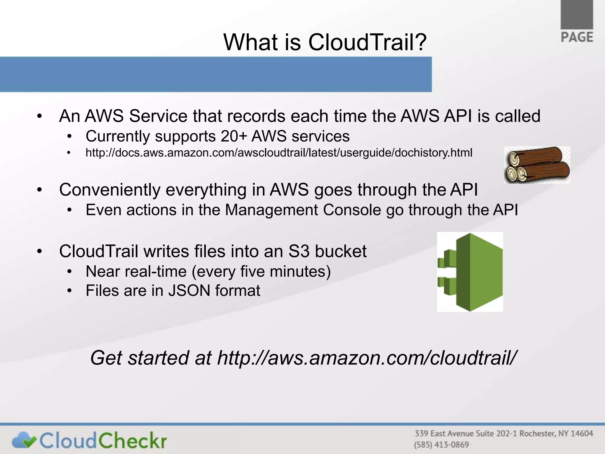 CloudTrail is an AWS service that records API calls across various AWS services, storing logs in JSON format in S3 buckets for near real-time monitoring of user and administrator activities. It does not replace logging at other layers and is primarily for tracking who performed what actions without detailed event explanations. Proper configuration and management of CloudTrail are essential for enhancing security and compliance, and recommendations include enabling it across all regions and considering best practices for log accessibility and tamper resistance.