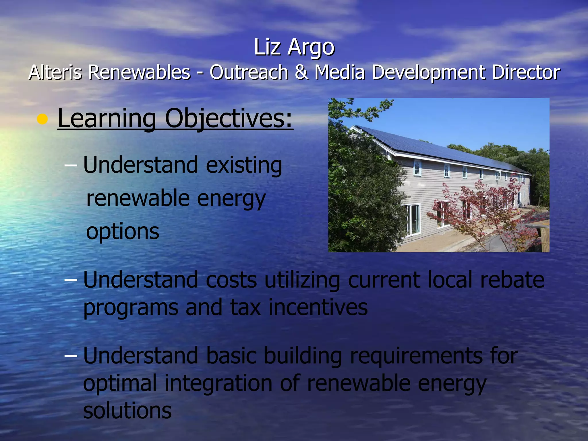 This presentation covers renewable energy options including solar thermal, photovoltaics, and wind. It discusses the basic technology behind each option, costs, financial incentives, and considerations for installation such as roof orientation and shading issues. Installation costs can be recouped in 5-7 years for solar thermal and wind may provide the quickest payback if installed in an appropriate location.