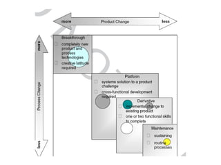 This document provides an overview of new product management. It discusses what constitutes a new product, including new-to-the-world products, new category entries, additions to product lines, and product improvements. It also discusses what makes a product successful. The document then covers the basic new product development process, which includes phases for opportunity identification, concept generation, concept evaluation, development, and launch. It provides details on some of the key activities within each phase.