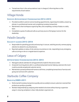 This document is a resume for Melissa Saenz summarizing her skills and work experience. She has developed strong computer, multi-tasking, communication, presentation, and adaptability skills through various roles. Her education includes coursework covering all Microsoft software at an advanced level from Robertson College and Mount Royal University. Her experience includes roles as a lab technician, service appointment coordinator, security guard, appointment coordinator, and barista at organizations like Maxxam, Village Honda, Lexus of Calgary, and Starbucks. In these roles she gained experience in tasks like managing multiple stations, providing excellent customer service, maintaining clean workspaces, and completing monetary transactions.