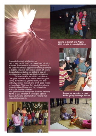 This document provides an update from a ministry working in rural villages in Latvia. It discusses providing assistance to those in need, growing children's ministry programs, starting new home groups and Bible studies, visiting the elderly during winter, and hopes for expanding transportation options to better serve the community. The ministry aims to prove God's love through deeds by helping those experiencing poverty, illness, loneliness, and more. They are thankful for continued support and look forward to what God will accomplish through their efforts in the coming year.