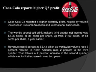 Coca-Cola reported higher third quarter profits with revenue up 5% and worldwide volume rising 5%. The World Bank warned of risks from rising capital flows to East Asia and said authorities need to carefully manage inflows to avoid bubbles. Apple CEO Steve Jobs declared victory over BlackBerry, citing Apple's 70% jump in quarterly profits and strong sales of iPhones and iPads.